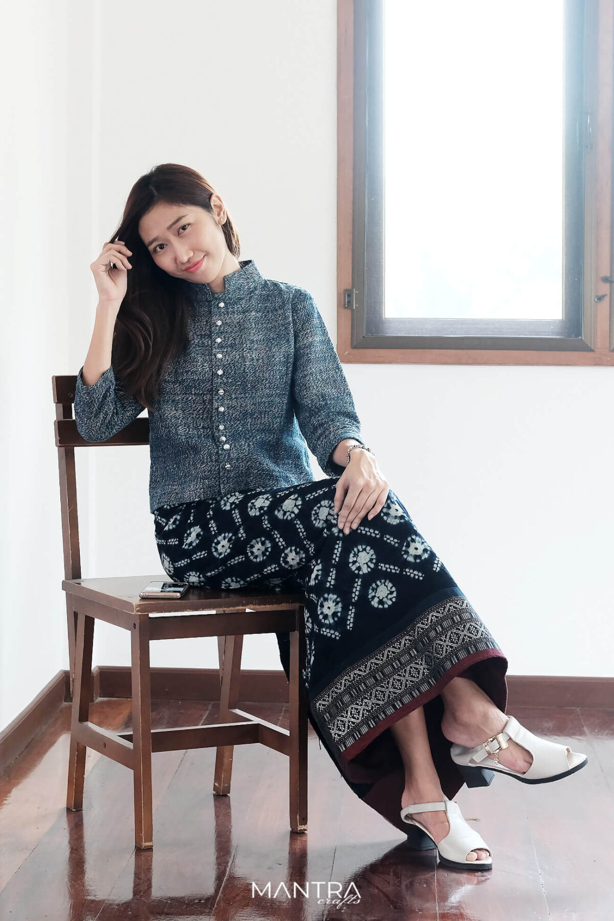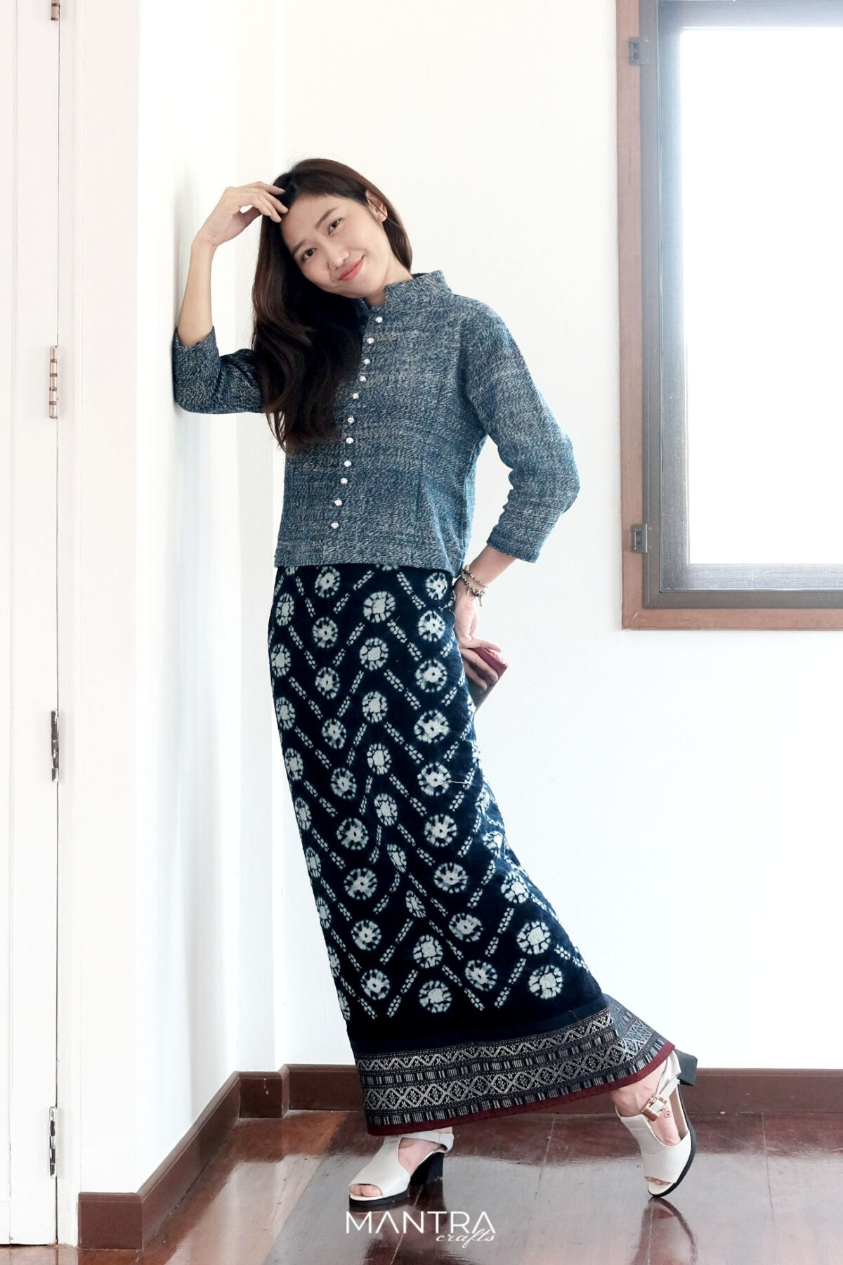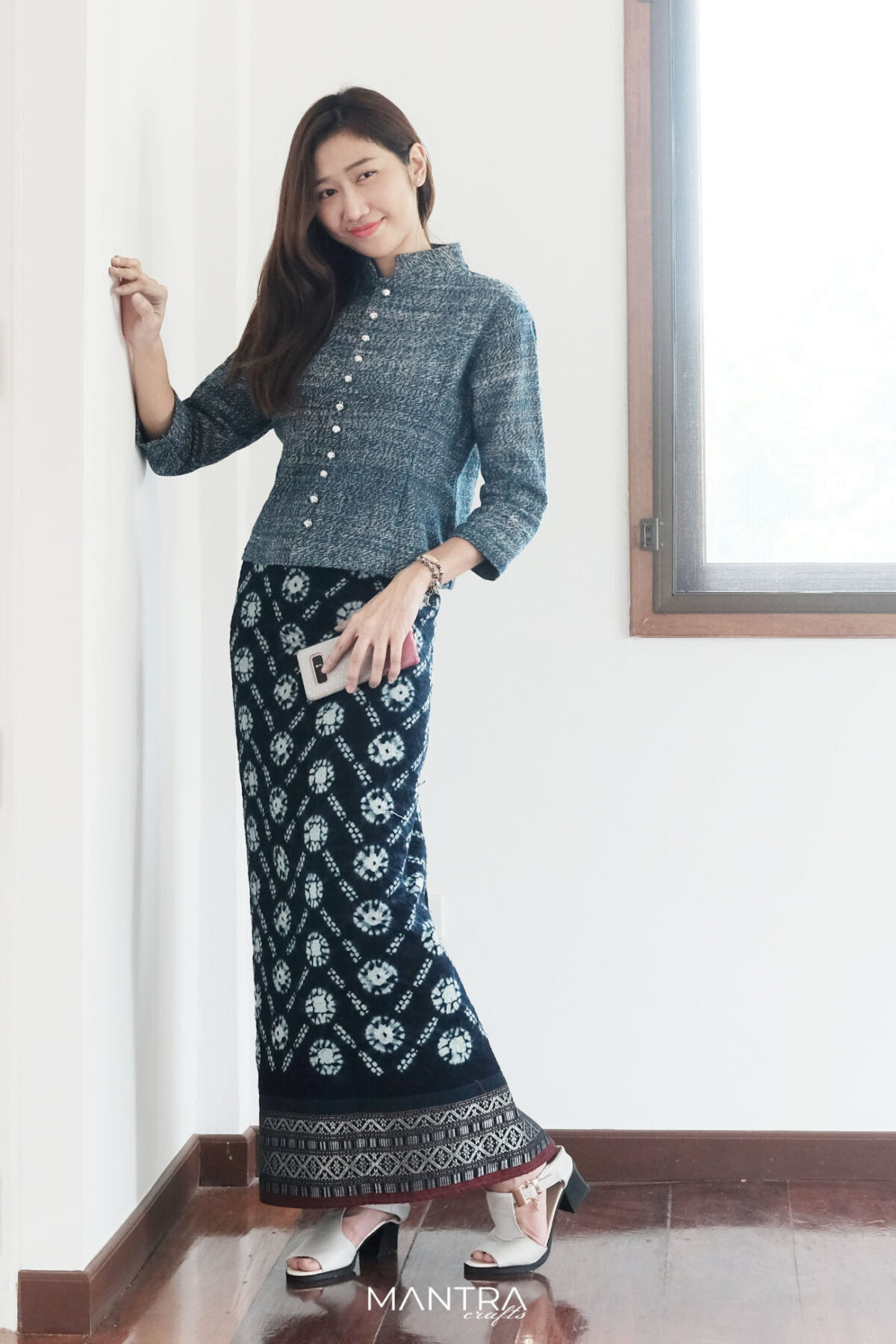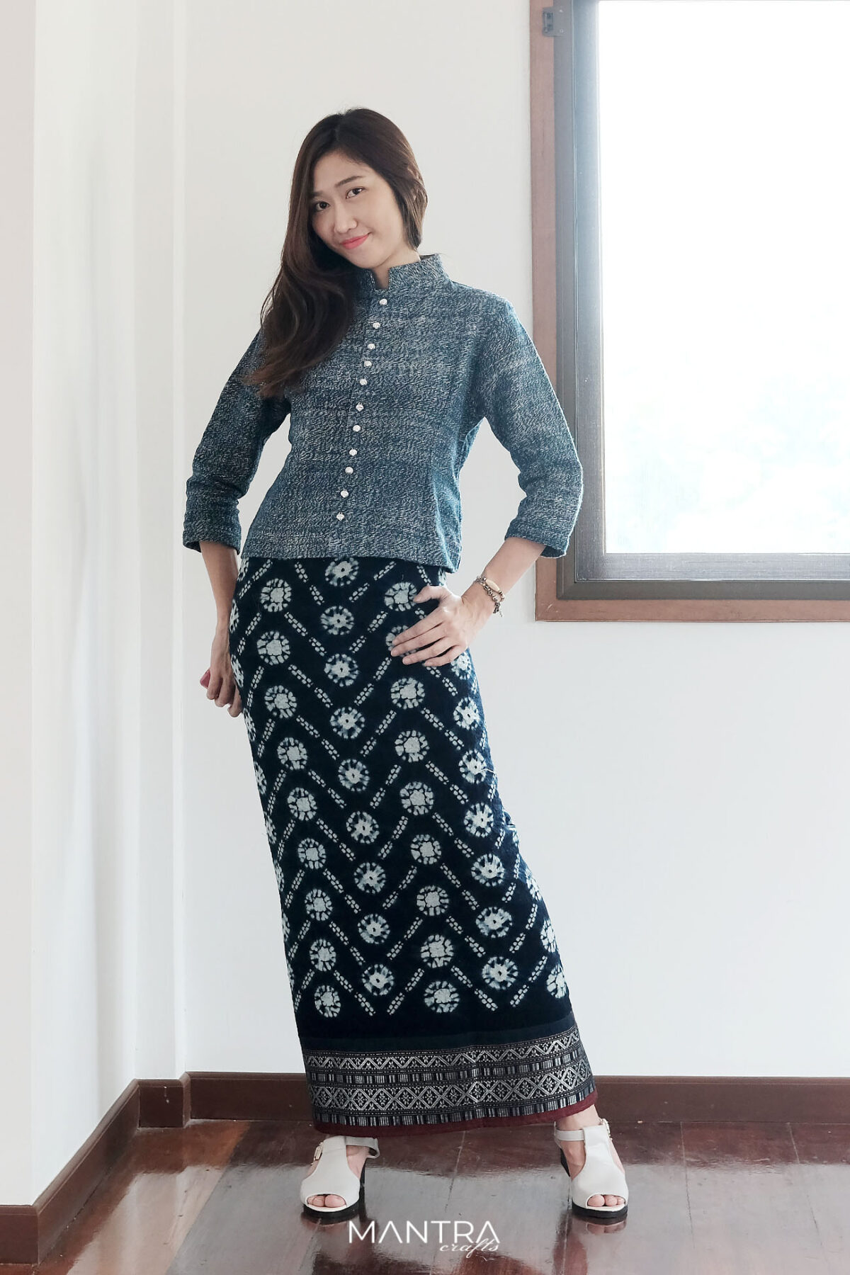ผ้าถุงลายล้านช้าง ที่ถอดแบบลวดลายมาจากผ้าถุงโบราณของเจ้าหญิงเมืองล้านช้าง เรายังทอเชิงซิ่นแบบสั้นมาต่อกับผ้าถุง ซึ่งเชิงแบบนี้เป็นเอกลักษณ์ของผ้าถุงทางฝั่งอาณาจักรล้านช้าง อาณาจักรดั้งเดิมของทางจังหวัดเลย ปัจจุบันยังมีให้พบเห็นได้ทั่วไปในฝั่งลาวอีกด้วยค่ะ ส่วนเชิงซิ่น ทอจากฝีมือช่างในจังหวัดเลย ด้วยดิ้นเงินโลหะของแท้ (ที่ตอนนี้ขาดตลาดและนำเข้าได้ยากมากค่ะ)